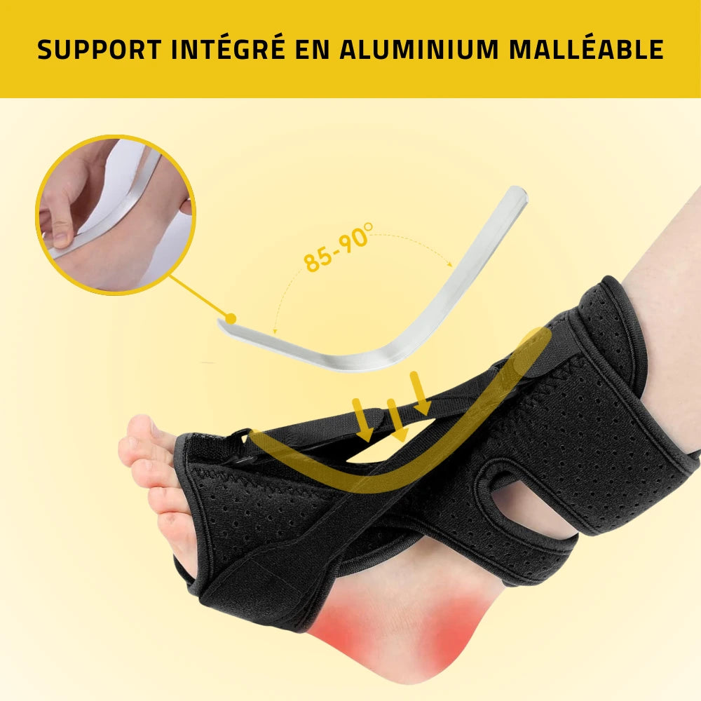 Avec son support en aluminium malléable, l’Orthèse Pied maintient le pied dans un angle idéal (85-90°) pour réduire la tension et améliorer la posture.