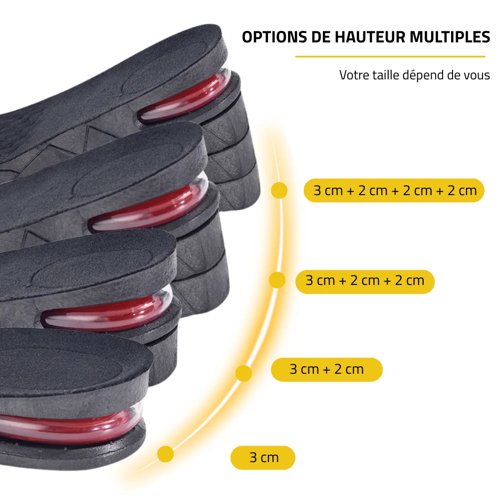 Les semelles offrent une élévation modulable de 3 cm à 9 cm, grâce à leur système de couches superposables.