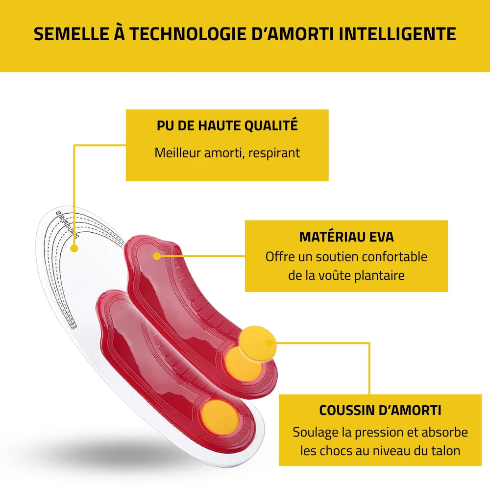 Grâce à leur design ergonomique, elles répartissent la pression sur l’ensemble du pied, réduisent l’impact sur le talon et offrent un amorti renforcé qui absorbe les chocs, soulageant ainsi les douleurs plantaires.